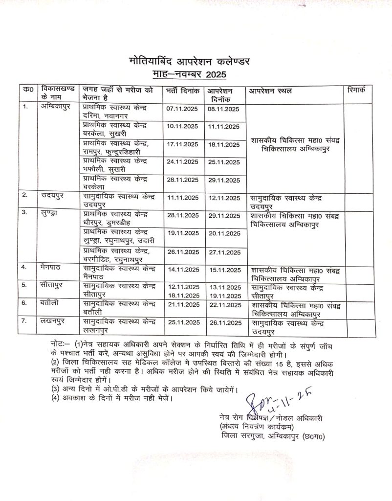 मोतियाबिंद ऑपरेशन का नवंबर 2025 कैलेंडर जारी,7 नवंबर से सरगुजा में…