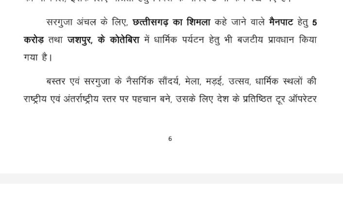 पर्यटन को बढ़ावा देने के लिए मैनपाट एवं कोतेबिरा को 5 करोड़ की राशि का प्रावधान रखा गया है।