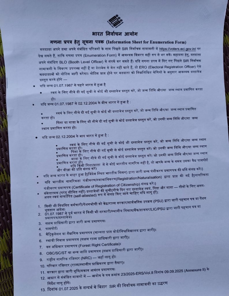 10 नवम्बर 2025/The Chalta/मैनपाट/सीतापुर/सरगुजा:भारत निर्वाचन आयोग ने मतदाता सूची के वार्षिक पुनरीक्षण के लिए SIR प्रक्रिया की शुरुआत कर दी है। इस बार गणना प्रपत्र से पहले जारी सूचना पत्रक में पात्रता, आयु सत्यापन और नागरिकता से जुड़े महत्वपूर्ण प्रावधानों को विस्तार से स्पष्ट किया गया है। मैनपाट तहसील में प्रशासनिक टीम गांव गांव पहुंचकर लोगों को दस्तावेज़ों की अनिवार्यता और सही तरीके से फॉर्म भरने की जानकारी दे रही है।