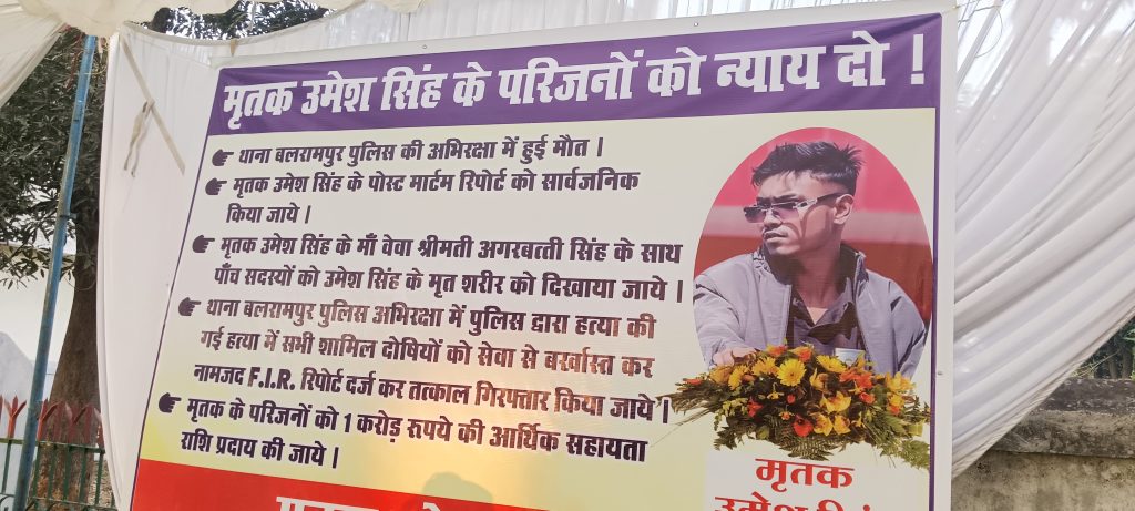 सीतापुर/बलरामपुर। थाना बलरामपुर पुलिस की अभिरक्षा में हुई उमेश सिंह की संदिग्ध मौत के मामले ने तूल पकड़ लिया है। प्रशासन की समझाइश न मानते हुए मृतक के परिजनों ने कांग्रेस कार्यालय के समीप धरना शुरू कर दिया।