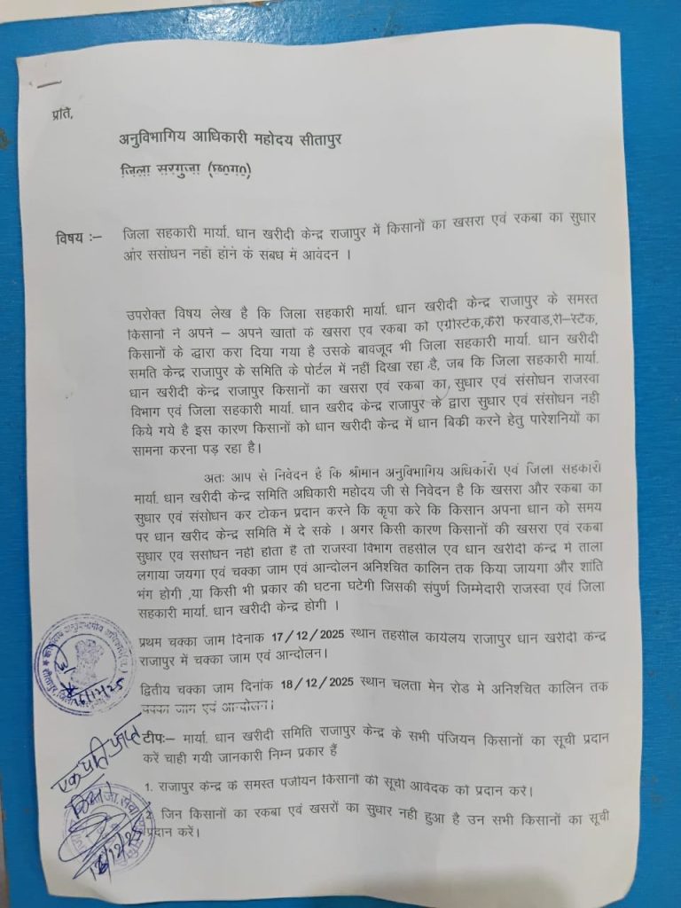 The Chalta/सीतापुर राजापुर तहसील अंतर्गत धान खरीदी केंद्र राजापुर एवं खड़गांव में किसानों के खसरा व रकबा सुधार और संसाधन अपडेट नहीं होने से धान बिक्री में गंभीर दिक्कतें आ रही हैं। किसानों का आरोप है कि सुधार के बावजूद पोर्टल पर जानकारी दर्ज नहीं की गई। समस्या के समाधान की मांग को लेकर किसानों ने 17 दिसंबर को तहसील कार्यालय राजापुर और 18 दिसंबर को चलता मेन रोड पर अनिश्चितकालीन चक्का जाम की चेतावनी दी है। किसानों ने प्रशासन से शीघ्र सुधार की मांग की है।