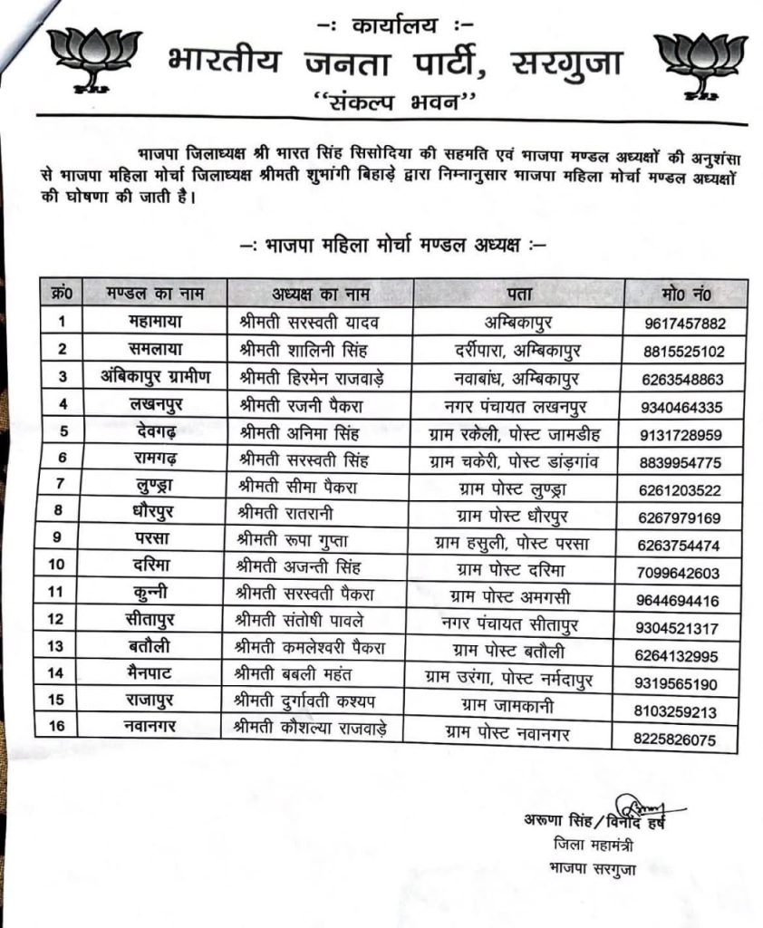 सीतापुर से संतोषी पावले, मैनपाट से बबली महंत और राजापुर से दुर्गा कश्यप बनीं मंडल अध्यक्ष, कार्यकर्ताओं में उत्साह