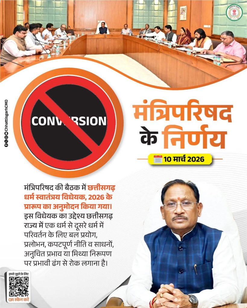 मंत्रिपरिषद ने छत्तीसगढ़ धर्म स्वातंत्र्य विधेयक, 2026 के प्रारूप को अनुमोदन दिया। इस विधेयक का उद्देश्य राज्य में एक धर्म से दूसरे धर्म में बलपूर्वक, प्रलोभन देकर, कपटपूर्ण तरीकों, अनुचित प्रभाव या मिथ्या निरूपण के माध्यम से किए जाने वाले धर्मांतरण पर प्रभावी रोक लगाना है।