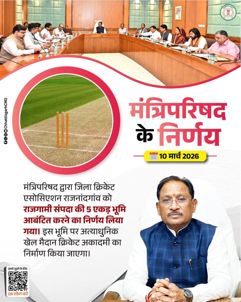 इसके अलावा खेल अधोसंरचना को बढ़ावा देने के लिए मंत्रिपरिषद ने जिला क्रिकेट एसोसिएशन राजनांदगांव को राजगामी संपदा की 5 एकड़ भूमि आवंटित करने का निर्णय लिया। इस भूमि पर अत्याधुनिक क्रिकेट मैदान और क्रिकेट अकादमी का निर्माण किया जाएगा।