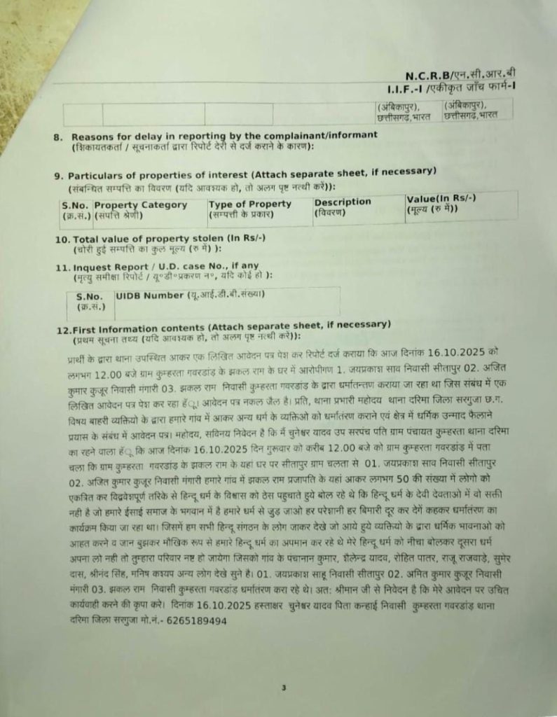 16 अक्टूबर 2025 को पुलिस को सूचना मिली कि जयप्रकाश साव और अजित कुमार कुजूर द्वारा झकल राम प्रजापति के घर पर लोगों को इकट्ठा कर हिंदू धर्म के प्रति अपमानजनक बातें कही जा रही थीं और धर्मांतरण के लिए प्रेरित किया जा रहा था। ग्रामीणों ने मौके पर पहुंचकर इसकी पुष्टि की और इसकी शिकायत थाना दरिमा में दर्ज कराई।